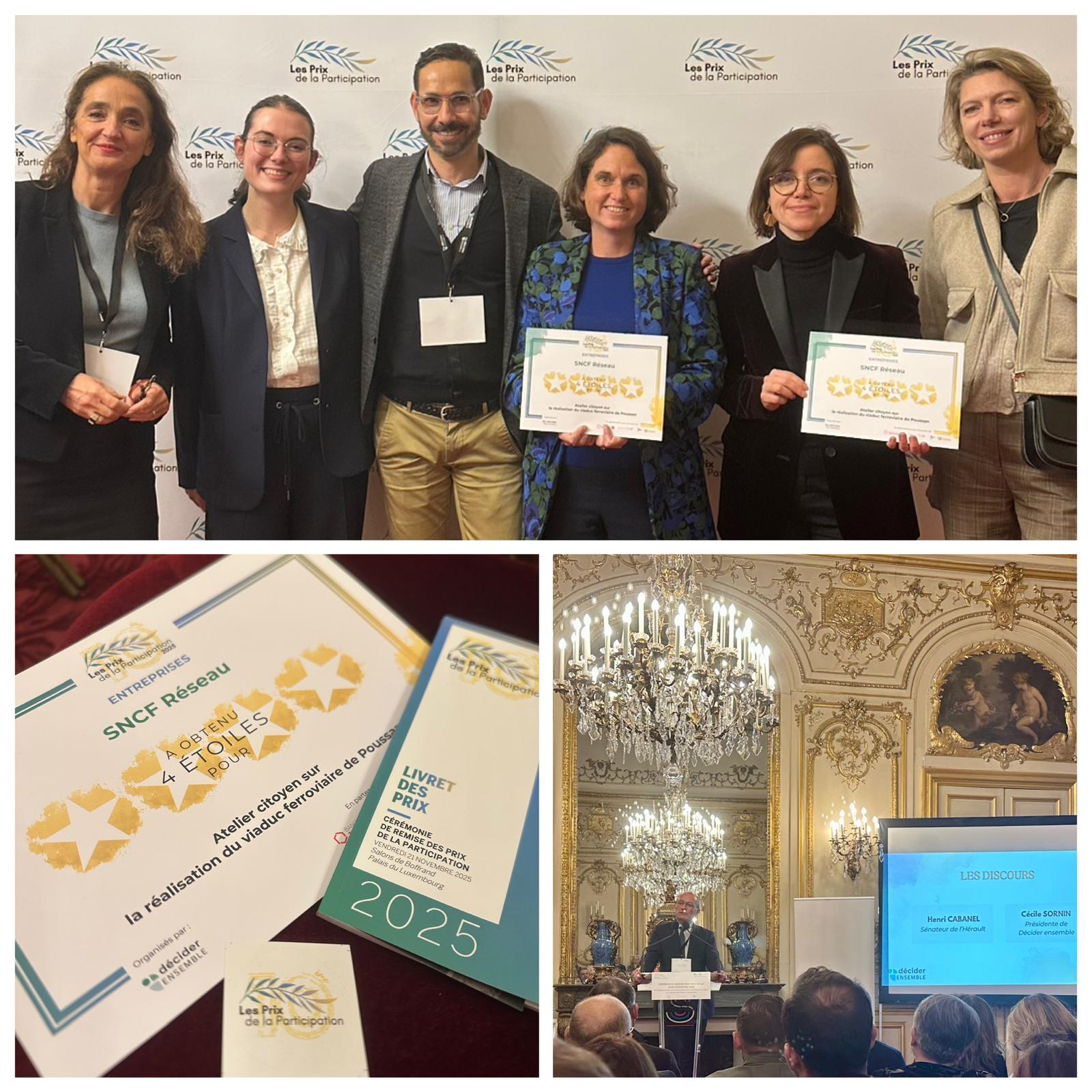 L’équipe LNMP a reçu le Prix 4★ de la Participation décerné par Décider Ensemble, récompensant la qualité de l’atelier citoyen mené autour de la réalisation du viaduc de Poussan. Cette distinction a été remise le vendredi 21 novembre, lors de la cérémonie officielle au Palais du Luxembourg, par un jury de professionnels de la participation citoyenne.