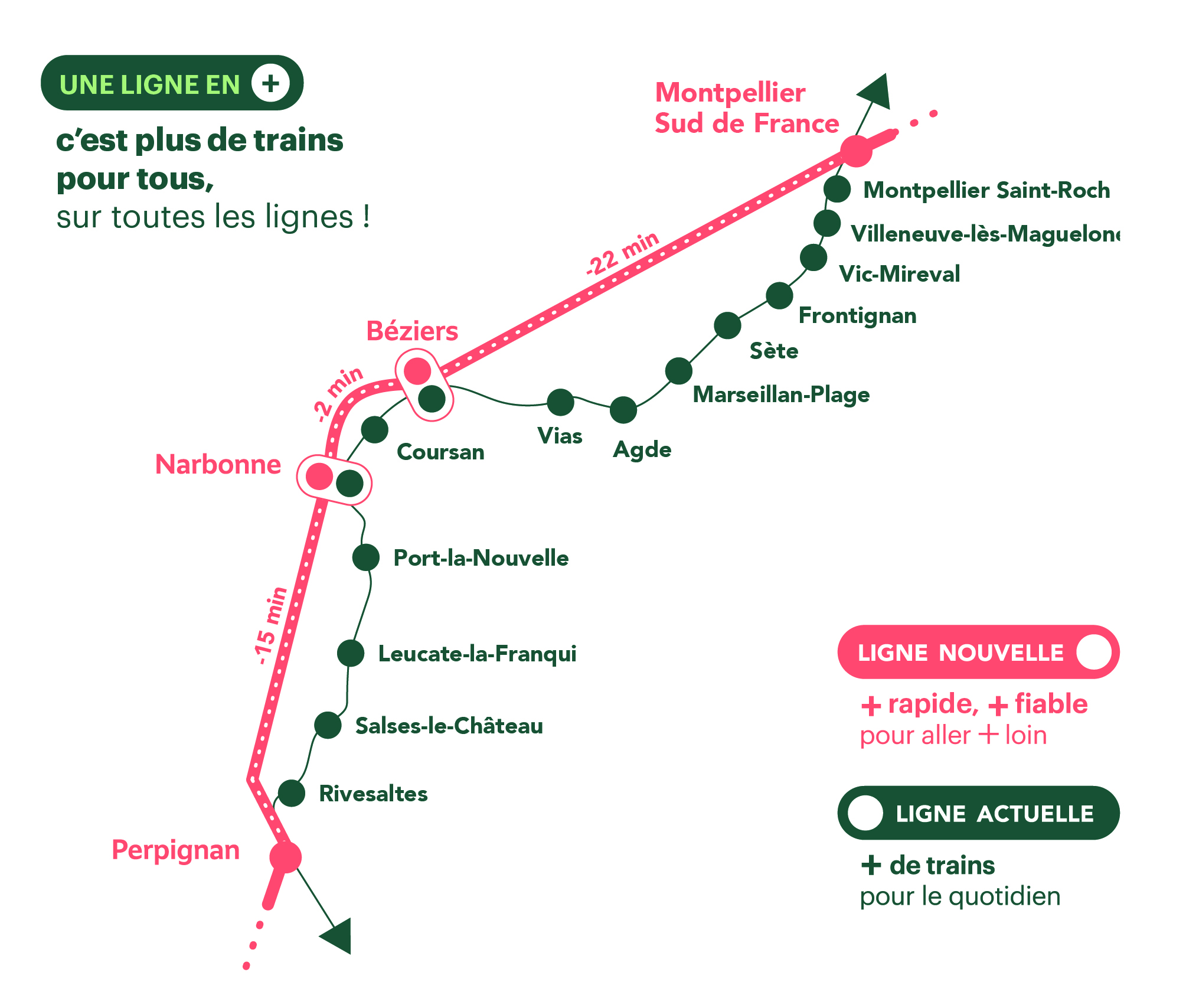 - Une section mixte "voyageurs et fret" dans la Plaine du Roussillon entre Rivesaltes et la ligne Perpignan-Figueras