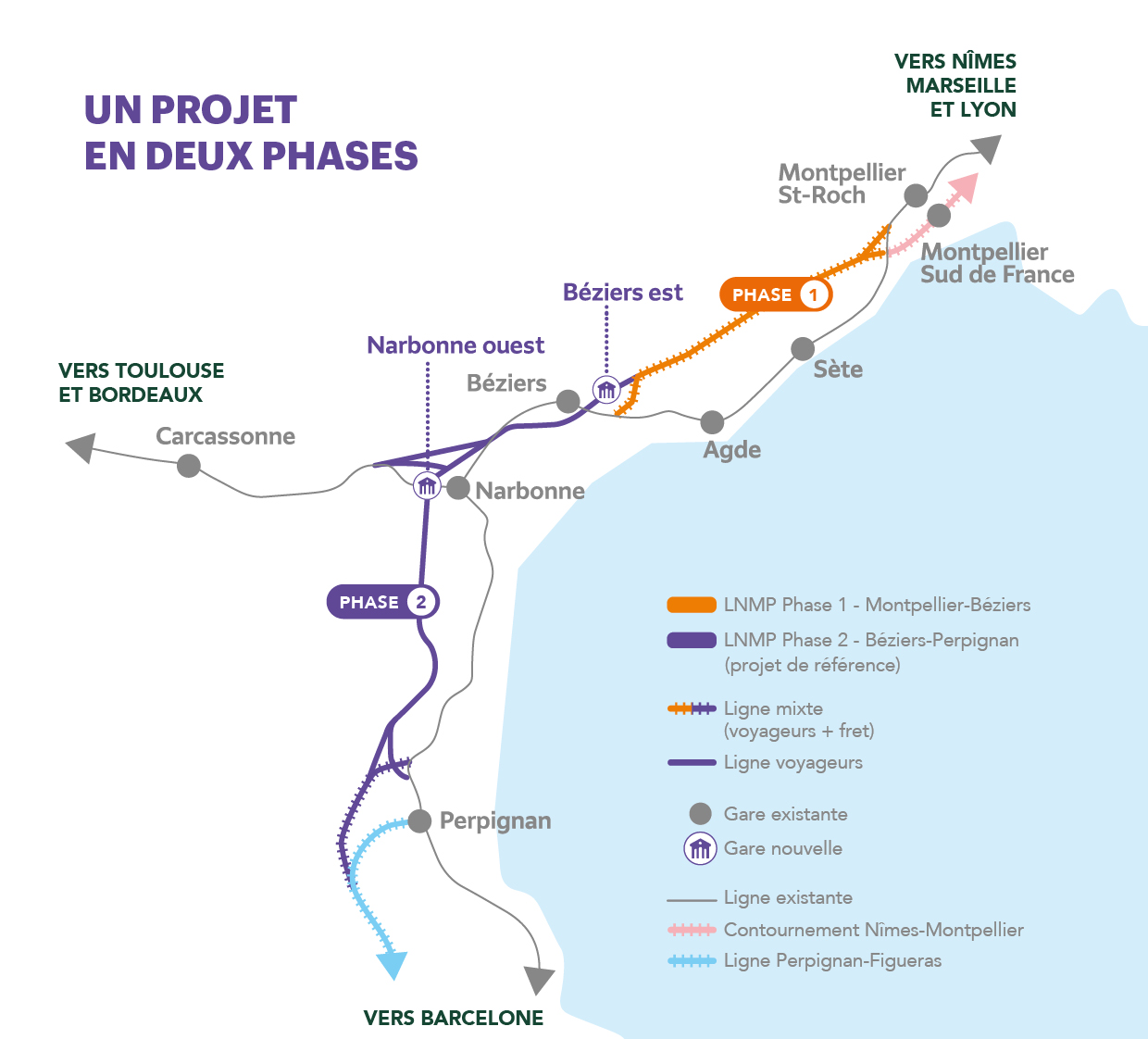 En 2017, le projet est confirmé par décision ministérielle avec une réalisation en deux phases : d'abord le tronçon Montpellier-Béziers (phase 1), puis celui de Béziers-Perpignan (phase 2). En 2019, la loi d'orientation des mobilités (LOM) acte le caractère prioritaire du projet LNMP et fixe le calendrier de réalisation avec un début des travaux avant fin 2029 pour la phase 1, déclarée d'utilité publique en février 2023, et un délai de réalisation de 10 ans maximum entre la phase 1 et la phase 2.